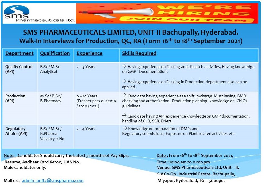 Sms Pharmaceuticals Walk In 16th to 18th Sept 2021 for Production QA RA